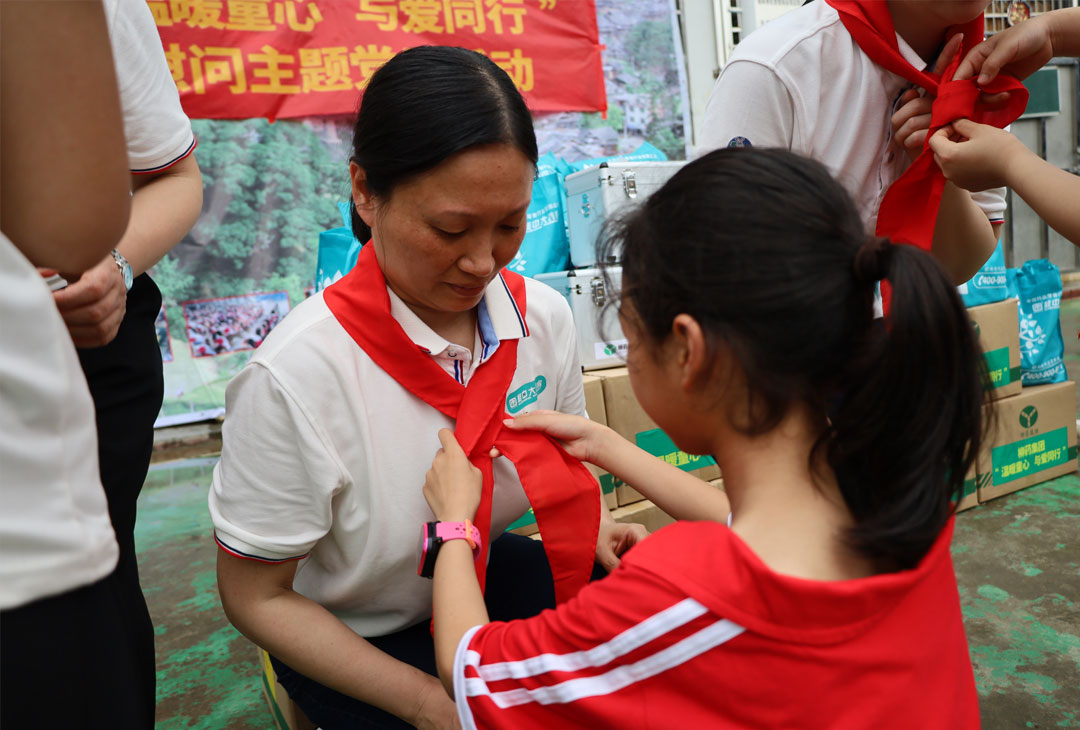 午后雨過天晴,在學(xué)校操場舉行了簡短的慰問捐贈(zèng)儀式,公司領(lǐng)導(dǎo)及合作伙伴給孩子們送來節(jié)日禮物及其他慰問物資。孩子們給我們戴上鮮艷的紅領(lǐng)巾。