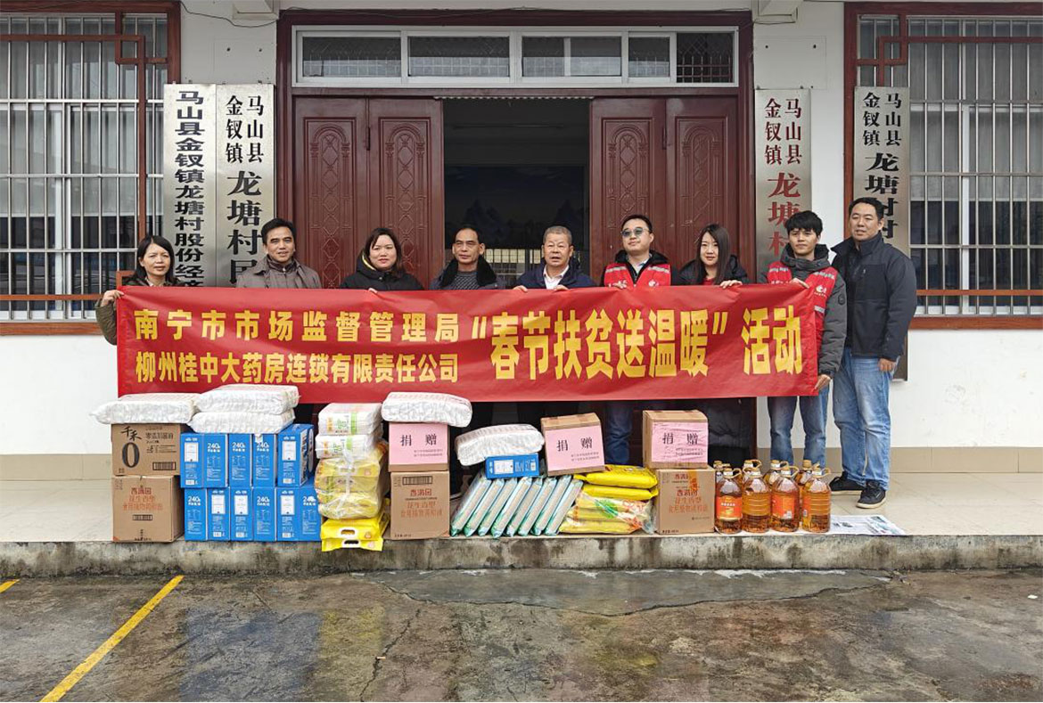 新春將至,歲寒送暖。為加大關(guān)愛力度,切實把溫暖送到脫貧戶的心坎上,鞏固脫貧成果,1月30日,南寧市場監(jiān)督管理局?jǐn)y手柳州桂中大藥房連鎖有限責(zé)任公司開展馬山縣龍?zhí)链?ldquo;春節(jié)扶貧送溫暖”活動,為群眾送上慰問品及新春祝福。